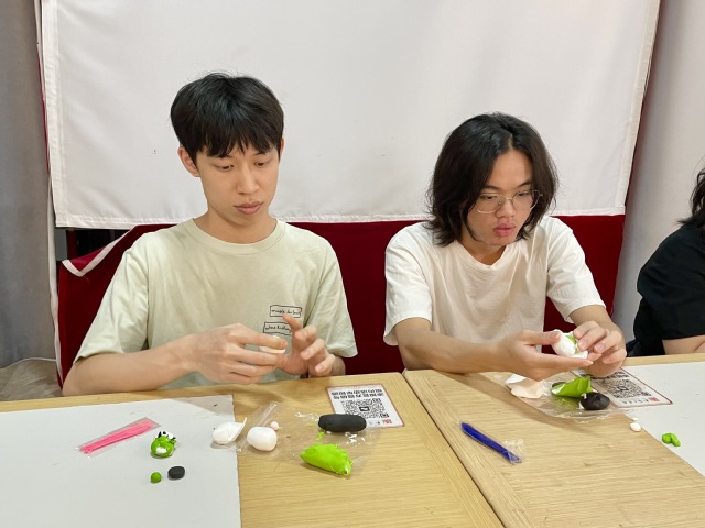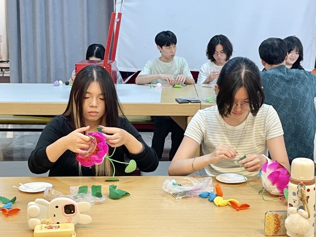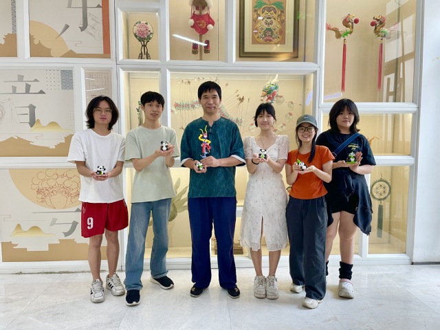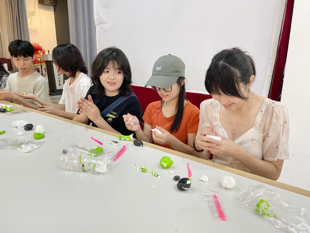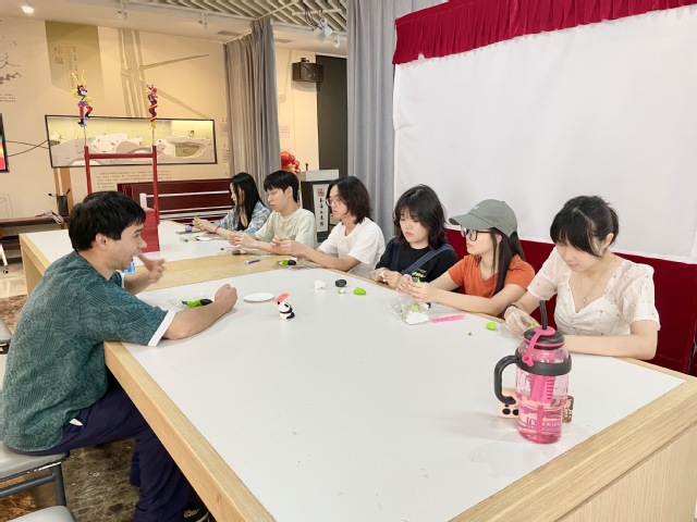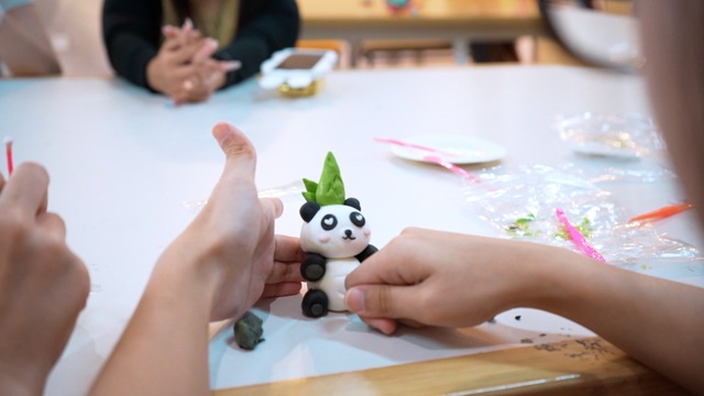 面塑组同学在李兴旺老师的指导下展现了丰富多彩的创意。马来西亚籍学生纪瑾筱注意到面塑易干的特性,还完成了熊猫抱竹的生动造型。另一位马来西亚籍学生杨棋全则感受到双色混泥的独特效果:“面塑材料和雕塑泥质感完全不同,触感很特别。”