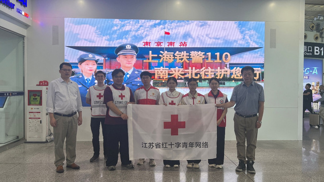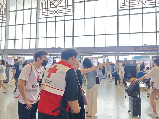 10月4日清晨8:45,黄泓斌准时抵达南京南站北广场。身着红马甲的他,协助警务人员处置突发情况,帮助携带大件行李的旅客搬运,为老年旅客、母婴群体指引路线、提供票务咨询,以耐心细致的服务缓解旅客出行压力。