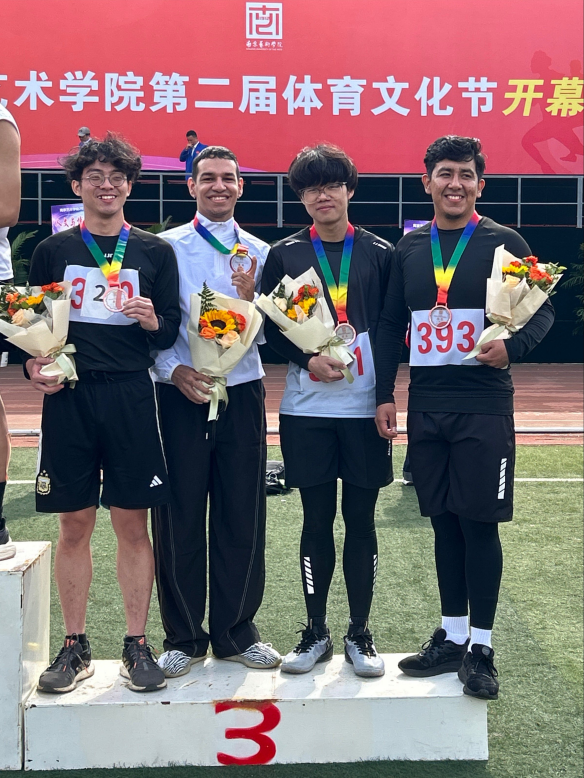 男子4×400米队成员默契配合,马来西亚籍学生郭肯儒、黄宇泽,萨尔瓦多籍学生韩森、江桐,通过赛前多次磨合交接棒节奏,以稳定表现获得第三名。