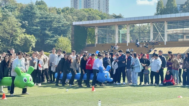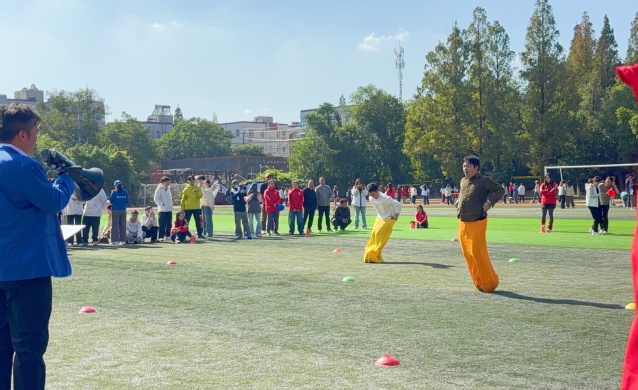 “袋鼠跳”项目里,廖全宇老师与吴强老师套布袋蹦跳前进,前者兼顾速度与平衡,还不时为后者加油,最终两人顺利冲线、击掌庆祝。
