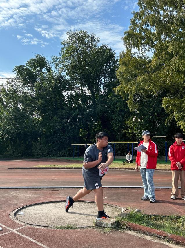 铅球赛场,欧阳为诚双手持球抵胸,深吸一口气后转动身体蓄力,猛地将球掷出,铅球在空中划出厚重弧线,落地时扬起细小沙尘,最终位列第四。