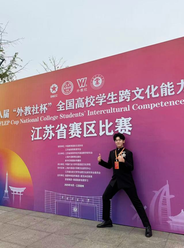 很荣幸能代表学校参加第八届“外教社杯”全国高校学生跨文化能力大赛(江苏省赛区),并与队友叶思维和安卿一起获得了一等奖。从备赛到舞台,我们一起确定主题、打磨内容、反复排练,每一次讨论都让我们在文化碰撞中找到新的灵感。比赛当天,我们带着彼此的信任与努力,用心呈现了属于我们的跨文化故事。这段经历让我深刻体会到合作与理解的力量,也成为我在大学生活中最珍贵的回忆之一。
