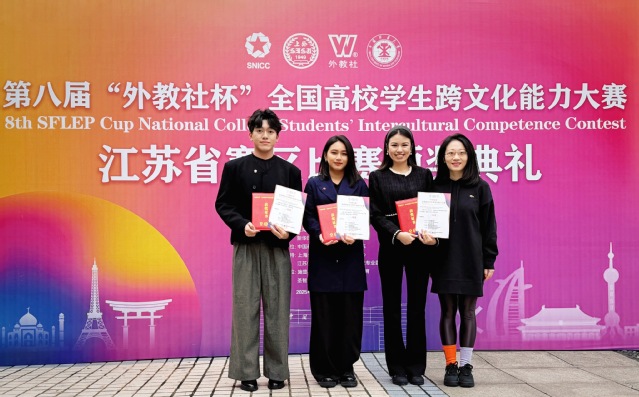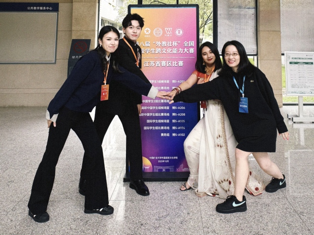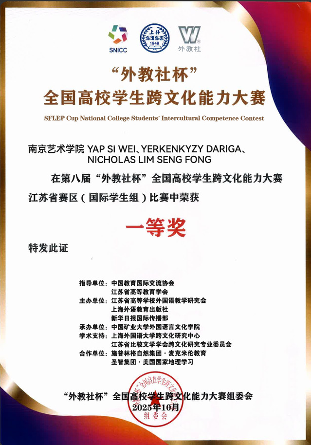 第八届“外教社杯”全国高校学生跨文化能大赛江苏省赛区于2025年10月24日至10月15日在徐州中国矿业大学举行。我校马来西亚籍学生SI WEI YAP(叶思维)、哈萨克斯坦籍学生DARIGA YERKENKYZY(安卿)、马来西亚籍学生SENG FONG NICHOLAS LIM(林成锋),组成的国际学生团队,经过激烈的比拼,最终获得了一等奖!